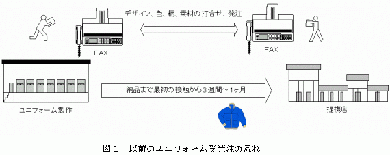 受発注はファックスを何回も介して手書きのデザインを起こし、また色を決めるのにも部材の一部を送って決めてもらうなど、決定までかなりの期間を要していた。(図1)
