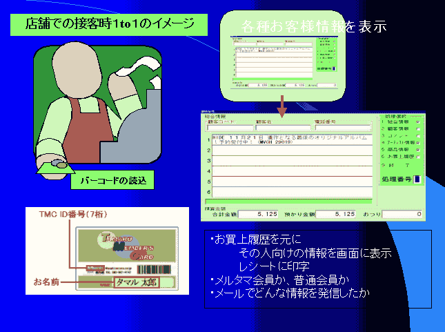 1to1マーケティング、POSシステム、オンライン受発注、顧客データベース、商品データベース |