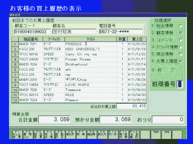 こうした顧客情報、コメント、アーチスト情報、商品情報など6つの情報が、接客する店員側に向いたレジスターの画面に表示されるので、その表示を見ながらお客様にいろいろな説明ができるわけです。