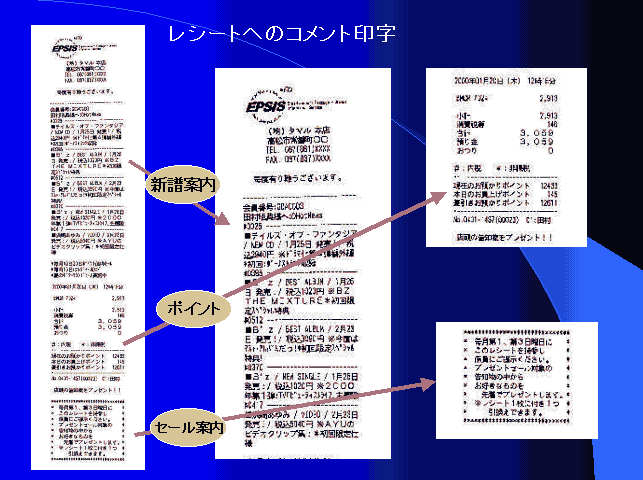 お客様に対しては、こんな商品がいついつ発売されますというふうな情報がレシートに印字されます。お買上ごとにプレミアムポイントがつきますが、ポイントカードは持たずに会員カードで兼ねています。レシートにポイントが印字されていますから証拠になるし、お客様は情報を載せたレシートを捨てずに大事に持っていてくださって、うまく機能しています。お客様に伝えたい情報を本部のサーバーにセットすれば、支店では任意にそのお客様が来た時にプリントアウトされる仕組みです。
