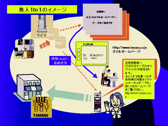 Oneは無人化です。これは携帯電話のショートメールを駆使してやっています。お客様履歴を活用し、このお客様にはこんな情報をさしあげたらいい。という内容を商品の発売情報などと照らし合わせて携帯電話にショートメールで送ります。もちろん、事前にお客様にショートメールの契約をしていただきますが、契約に費用はかかりません。お客様にショートメールを発信すると同時にホームページにそれよりももっと詳しい情報のページを作ります。メールの中には「ホームページにもっと詳しい情報が載っていますからそれも見てください」など商品情報を流し、もしメールで注文いただいたら、いつ頃入荷するかをメールで返信します。「今日はお誕生日おめでとうございます」などいろんなことを考えていけると思います。これらが全部無人化できますから、コストがあまりかからないのも大きなメリットです。