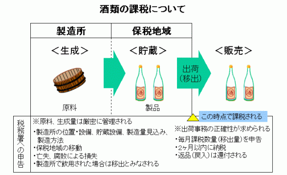 ・酒税は、製造場から出荷した酒類、または輸入した酒類の数量に一定の税率を乗じて計算する。その、税率は、種類、品目及びアルコール分などに応じ細かく定められている。