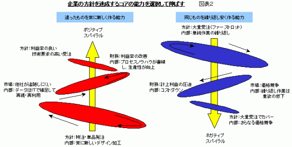 左の場合ポジティブ(好ましい)スパイラル(らせん的繰り返し)と関連していると言え、右の場合ネガティブ(好ましくない)スパイラルと関連していると言える。経営者は自社に必要とされるコアの能力の方向性を伸ばすことが重要であることも、この事例から読み取れる部分である。