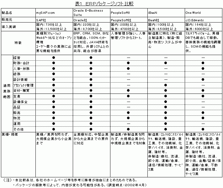 業務革新あるいは経営のスピードアップ化に有効といわれているERPパッケージソフトにはどんなものがあるのだろうか。良く話題にあがっているいくつかのERPパッケージソフトのそれぞれの導入実績、特徴、適用業務範囲等を参考までに整理してみた。(表1)