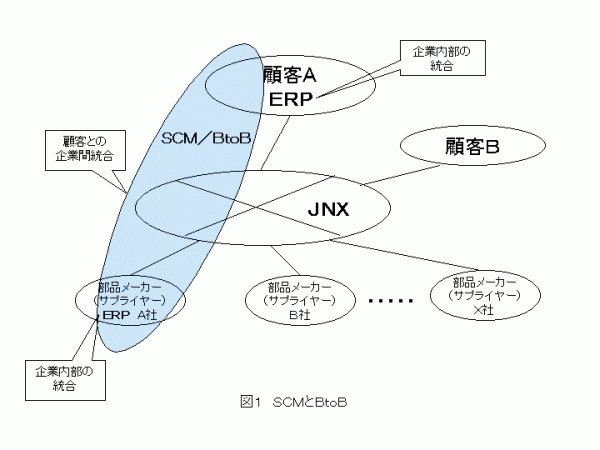 また、企業内の部分最適から全体最適への動きは、顧客、ベンダー/サプライヤーを含めた、業界全体としてのSCMやBtoB等を含めた全体最適化も追求されて行くことになろう。そこには、企業独自のアプリケーションやネットワークで競争しようとする意識は薄れ、業界共通のアプリケーションやデータフォーマット、さらにはネットワークの共通化が図られることとなる。ネットワークの共通化で言えば、自動車業界のJNX(注8)がその典型である。