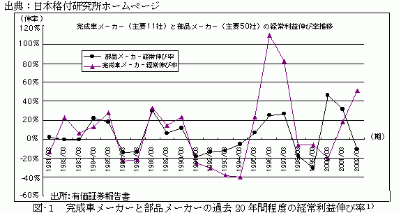 完成車メーカーと部品メーカーの過去20年間程度の経常利益伸び率について、株式会社日本格付研究所のレポートに報告されている。(図-1)