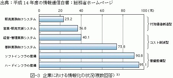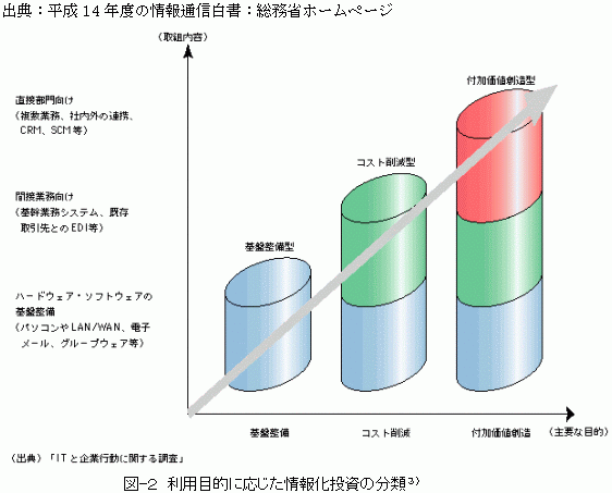 総務省の平成14年度の情報通信白書では、企業の情報化への取り組みについて、①主に社内における情報通信インフラの基盤整備を目的とする「基盤整備型」、
