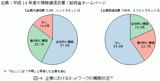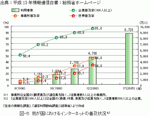また、平成13年情報通信白書によると300人以上の企業のインターネット普及率は1996年50.4%から1998年80.0%に急速に増加しており(図-5)4)、