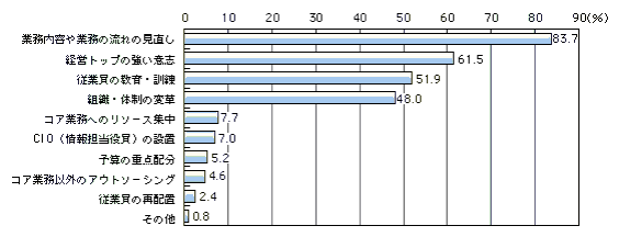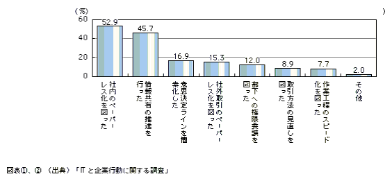 実際、図表2に示す「情報化投資に伴う業務内容や業務の流れ(ワークフロー)の見直し状況」では、社内及び社外も含めてペーパーレス化を図ったという結果が出ている。