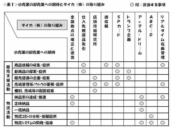 リテールサポートの強化と小売業の物流コスト削減を可能にするための卸売業の効率的物流活動への期待の大きさがわかる。これらの事項にダイカ(株)の取り組みの機能的要素をつき合わせてみると、ダイカ(株)が顧客(小売業)のニーズを的確に把握し、着実に対応し、さらに前に進もうとしていることが明らかになる。また、各取り組みが経営戦略の示すベクトル上に、実にバランスよく構成されていることが分かる。《表1》