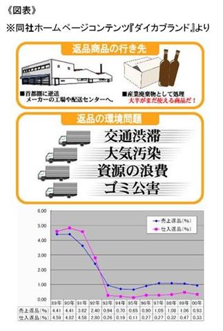 返品を、交通渋滞、大気汚染、資源の浪費、ゴミ公害などの環境問題を引き起こす根源と考え、企業の社会的責任を果たすための取り組みである。この取り組みは、同社の在庫リスクを増やすのではないかと心配するのだが、そのようなことはなく10年間の活動で確実な成果をあげている。これは、次項の「リアルタイム単品在庫管理」をベースに組織的な活動による成果であると推測できる。《図表》