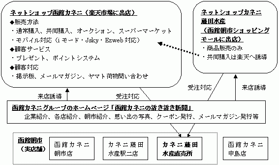 後者は事例本文中で藤田社長が今後の展望として語っておられるショッピングモールを2000年に実現されたものだが、函館朝市の実店舗200余のうち、インターネット上での販売が可能な水産加工品店は当該企業を含めた2社のみ。他店はすべて店舗紹介および電話での受注受付であり、