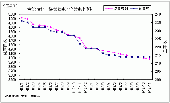 日本国内のタオル主要生産地のひとつである今治においても同様で、タオル生産に従事する従業員も減少の一途である。(図表2、図表3)