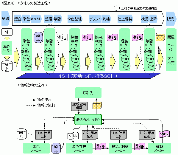 タオルの生産工程はおよそ13工程に分けられる。各々の工程を専門の会社が受け持つ形となっているが、生産・在庫・出荷の情報交換がなされておらず、