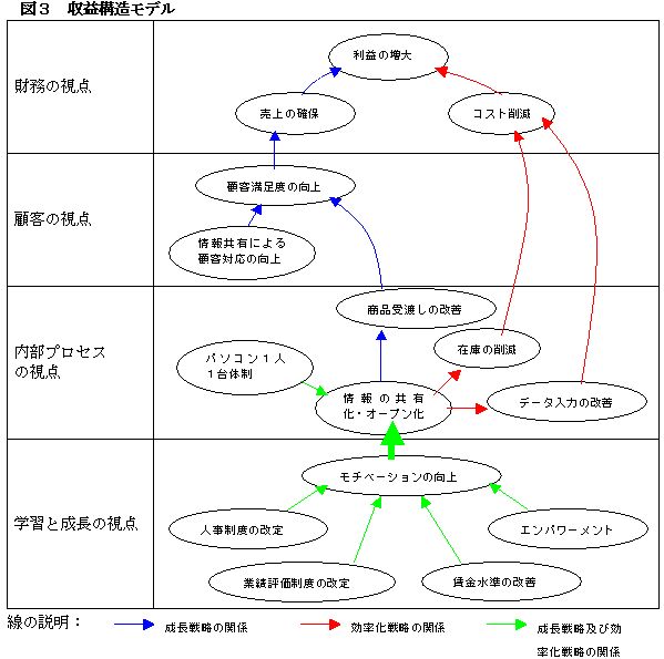 収益構造のモデル化においては、バランススコアカード(注4)の視点が有効である。バランススコアカードの四つの視点は相関性があるため、