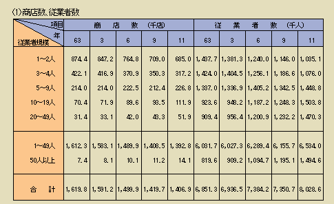 小売業の状況を示すデータとして、経済産業省「商業統計表」による『(従業者規模別)小売業の商店数、従業員数、販売額』の資料がある。《表1》 昭和63年と平成11年を比較すると、全体傾向では"商店数"が90%を割っているが、"従業者数"、"年間販売額"が堅実に増加している。また、"1人当たり販売額"も改善されている。