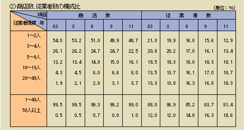 しかし、従業者規模別の内容をみると、"商店数"、"従業者数"、"年間販売額"は規模の大きい商店の構成比が高くなり、"1人当たり販売額"は規模の小さい商店ほど上昇傾向にある。このことから、商店が大型化しながら集約される傾向にあり、片や淘汰されながら小さくても独自に効率を高めている商店が生き残っているようにもみえる。