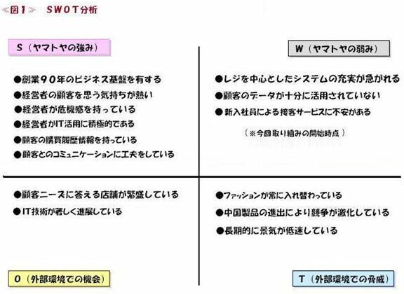 まず、ヤマトヤの経営を客観的にみるために、事例内容をベースにSWOT分析を行ってみる。強みとして際立つのはヤマトヤの長い歴史に培われた信用と、江頭社長の誠実で積極的な経営である。また、厳しい外部環境に危機感を持ちながら、的確に弱みの改善に取り組む姿勢も感じ取られる。≪図1≫