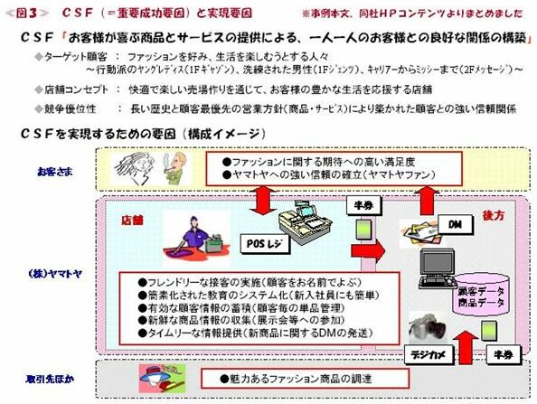事例本文と同社ホームページの内容から"ヤマトヤのCSF"を探ってみると、ファッションを好み、生活を楽しもうとする性別や世代を越えた幅広い客層をターゲットにした、「 お客様が喜ぶ商品とサービスの提供による、一人一人のお客様との良好な関係の構築 」であると思う。そして、事例にあるような情報を活用した顧客とのコミュニケーション、接客サービスの充実、魅力あるファッション商品の調達など、このCSFを実現するための一貫した活動であることがわかる。≪図3≫