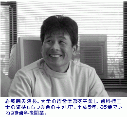 夫の岩﨑義夫院長とともに「いわさき歯科」の経営に携わる。一方で全国各地の歯科医院から依頼を受けスタッフの教育も手がける。