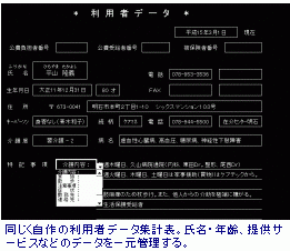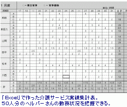 「Excel」も大活躍している。50名を数えるヘルパーさんの管理は、「Excel」でつくった「介護サービス実績集計表」で行う。 勤務状況や提供したサービス内容などを入力しておけば、給与も自動的に引き出せる。