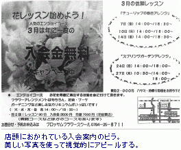 「ブロッサムフラワースクール」では、受講コースや年間カリキュラムの解説、体験レッスンの案内など手作りのチラシやビラを用意し、